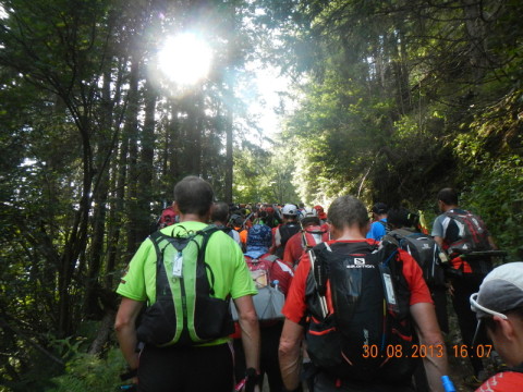 zu langsam. In diesem Jahr war ich 15 Minuten vor Ablauf des Zeilimits in der Verpflegungsstation angekommen. Eigentlich hatte ich hier eine kurze Dusche vorgesehen. Doch dafür fehlte mir leider die Zeit. Und so blieb mir eine hastige Kurzwäsche mit Kleidungswechsel, ein paar Bissen von einem Nudelteller, und schon wurde man von den Organisatoren aus dem Gebäude gejagt. Selbst ein kurzes Sitzen auf der Straße, vor dem Verpflegungspunkt, um noch schnell die Socken zu richten, wurde von der Organisation,- mir vollkommen unverständlicher Weise! -, nicht geduldet. Wo liegt der Unterschied, ob man noch dort auf der Straße kurz verweilt oder ein paar Meter weiter, irgendwo unbeobachtet, auf einer Parkbank am Wegesrand??? Die ablaufende Zeit verliert man so oder so...