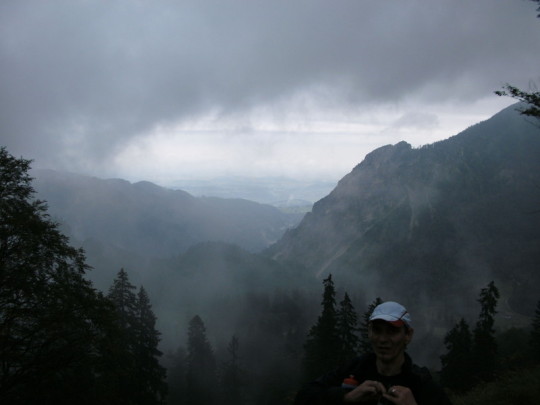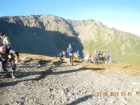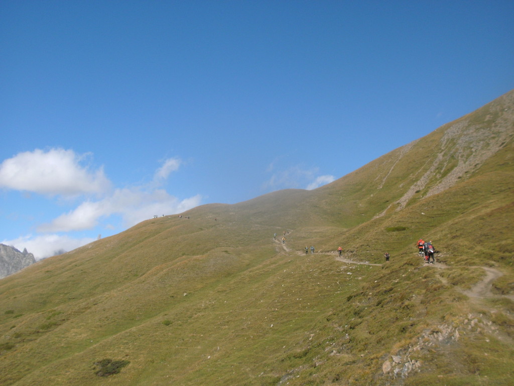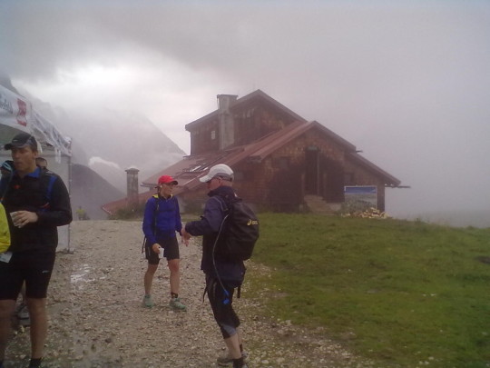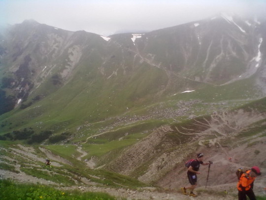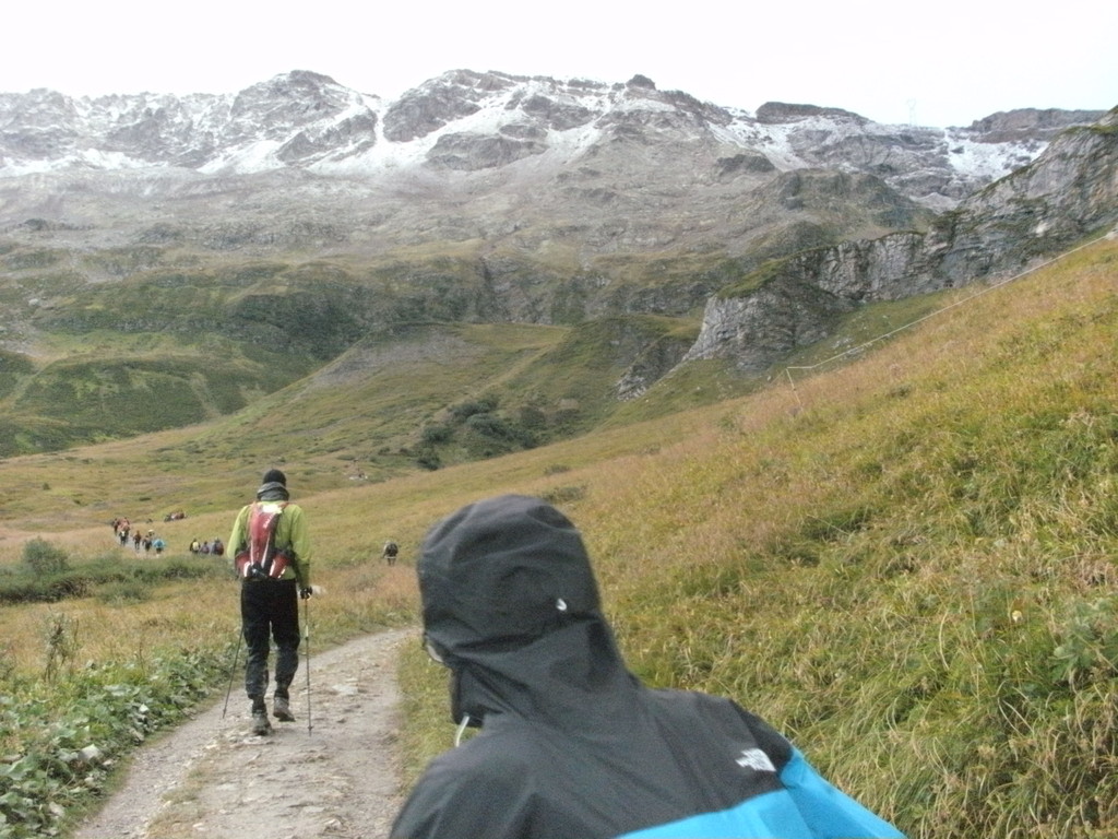 Schon kurz nach verlassen des Verpflegungspunktes geht es auf einen Singletrail zum Col Du Bonhomme. Eine sehr kräftezerrende Passage, über nur gut 3 Km, aber 600 Höhenmetern!!! Hat man den Col Du Bonnhomme endlich erreicht, warten immerhin nochmal 100 zusätzliche Höhenmeter auf 2 Km verteilt auf den Läufer. Für den Kopf keine leichte Angelegenheit. Der Körper wird hier schon an seine Grenze gebracht, zumindest meiner. Man sieht einfach kein Ende. Der Körper will endlich den Berg überwunden wissen, der Kopf aber weiß, anhand der Höhenangabe der Uhr am Handgelenk, dass dies erst bei angezeigten 2443 Höhenmeter der Fall ist. Nebelschwaden erschweren die Orientierung. Ich denke, "nun muß es doch endlich geschafft sein", aber der Weg zieht sich...und dann ist es vollbracht. Und diesmal erwartet einen nicht eine üppige Verpflegungsstation. Es wird nur kurz die Startnummer gescannt und es geht