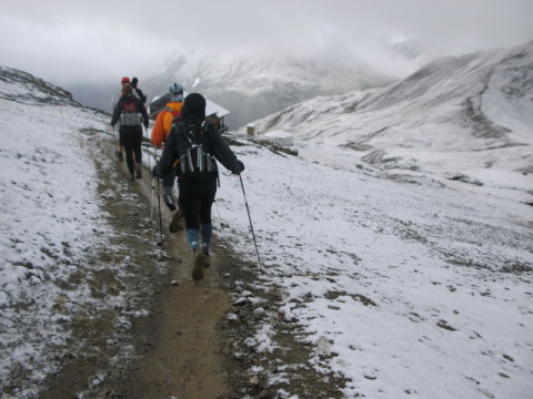 Anfangs geht es über große Felsplatten, später über einen breiteren Feldweg hinauf nach La Balme, dem nächsten Verpflegungspunkt, in 1700 Meter Höhe. Hier kann man sich nochmal an einem Lagerfeuer wärmen und sich für die Überquerung des Bonnhomme rüsten.