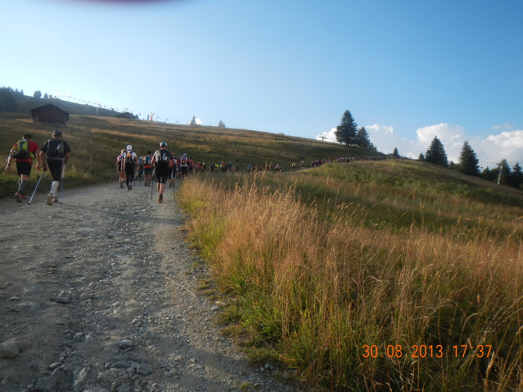 Hier gibt es auch ein Ärztezelt. Ich erzähle einer Ärztin von meinen Magenproblemen und sie gibt mir zwei Tabletten, die mir Linderung verschaffen sollen. Ich versuche noch etwas Suppe aufzunehmen, was mir aber leider nicht recht gelingen will. Mit der ablaufenden Zeitbarriere im Nacken, geht es ein kurzes Stück flach, zum nächsten Anstieg, zum Arrete Du Mont Favre. Die Sonne gewinnt schnell an Kraft. So sind die folgenden 4 Km und 500 Höhenmeter auf schmalen Pfaden, schon zu so früher Stunde, sehr schweißtreibend und strapaziös. Dafür bieten sich wundervolle Eindrücke der Landschaft, mit den Gletschern des Mont Blanc. Oben auf 2435 Metern angekommen, nutzen einige meiner Mitläufer und ich nochmal kurz eine kleine Verschnaufpause mit wunderschöner Aussicht auf die umliegende Bergwelt.
